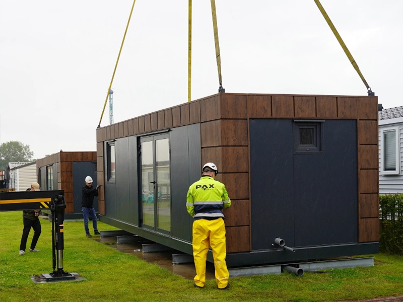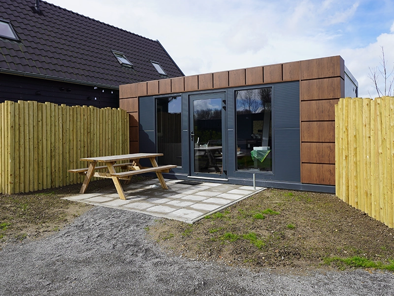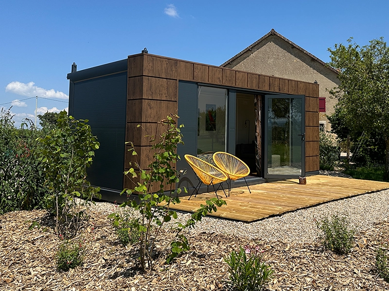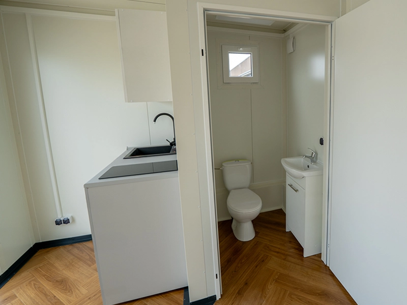 Conteneur abri de jardin 7×3 m avec toilettes et cuisine sur le côté gauche