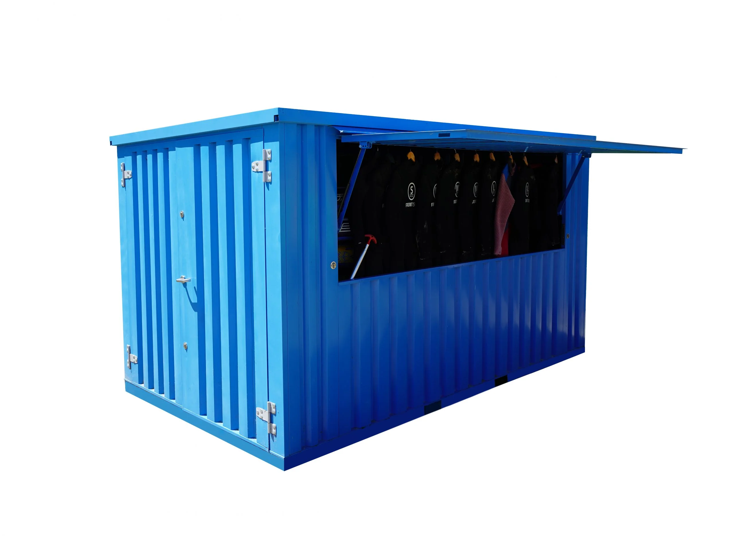 Le conteneur bar mesure environ 4×2 mètres et possède un auvent pliable, les dimensions sont approximativement les mêmes que celles d’un conteneur démontable de 16 pieds. C’est idéal pour les personnes qui attendent de se mettre au sec et cela donne au conteneur l’aspect d’un vrai bar. L’auvent peut également être fermé et verrouillé, ce qui permet de laisser le conteneur bar avec les affaires à l’intérieur en toute sécurité. De plus, il y a une double porte sur le petit côté qui permet de faire entrer des objets volumineux comme un fut de bière par exemple ou bien un frigidaire. Un conteneur de bar simple mais solide.