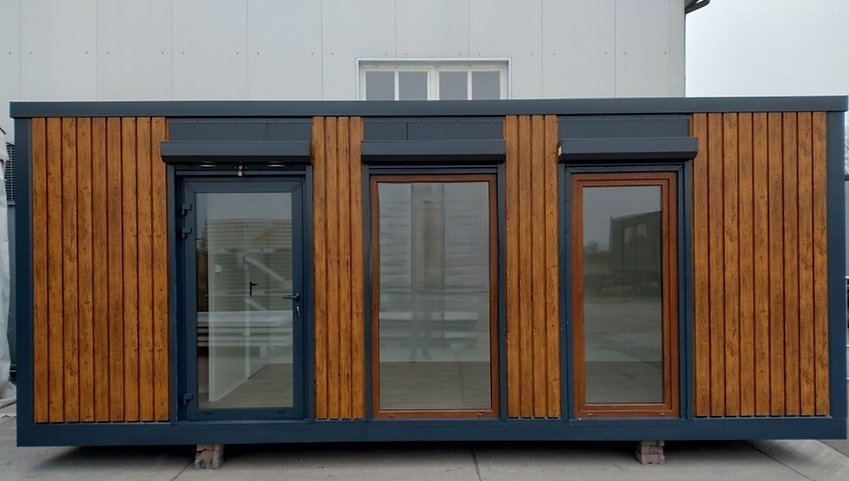 Finitions extérieures : façade graphite RAL 7016 avec décor chêne doré