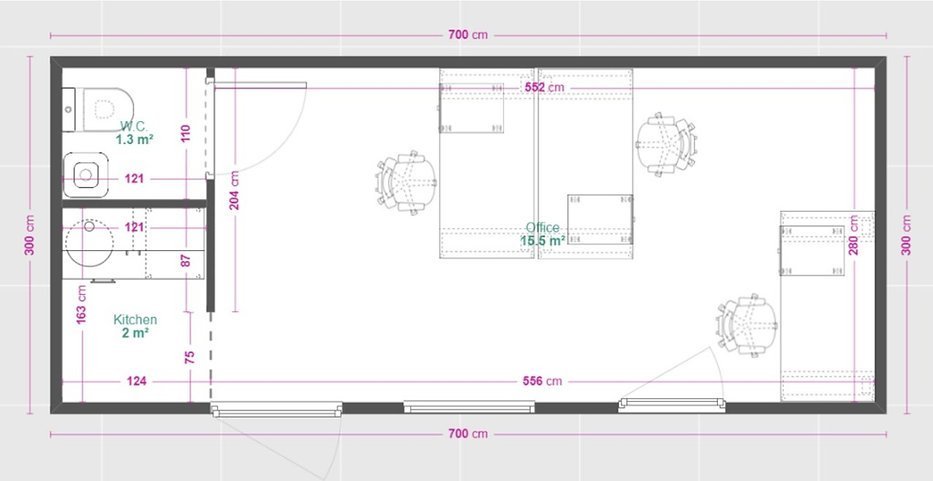 Extérieures : 7,0 m (L) x 3,0 m (l) x 2,8 m (H)