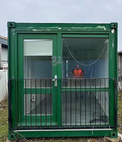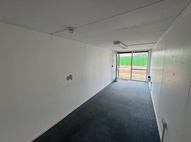 L’unité bénéficie de deux façades vitrées intégrant chacune une porte vitrée, pour une excellente luminosité naturelle et une circulation fluide. L’ensemble est équipé de radiateurs électriques, d’un revêtement de sol en moquette, et de finitions soignées. La peinture extérieure est réalisée en vert, pour une intégration discrète sur site.