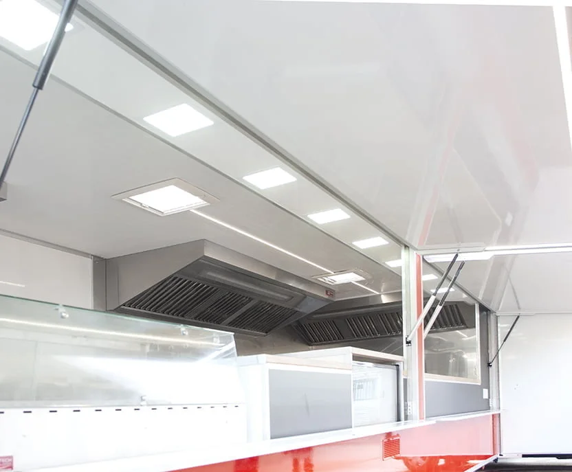 Une étagère de pavillon au dessus du comptoir de service avec spots LED intégrés