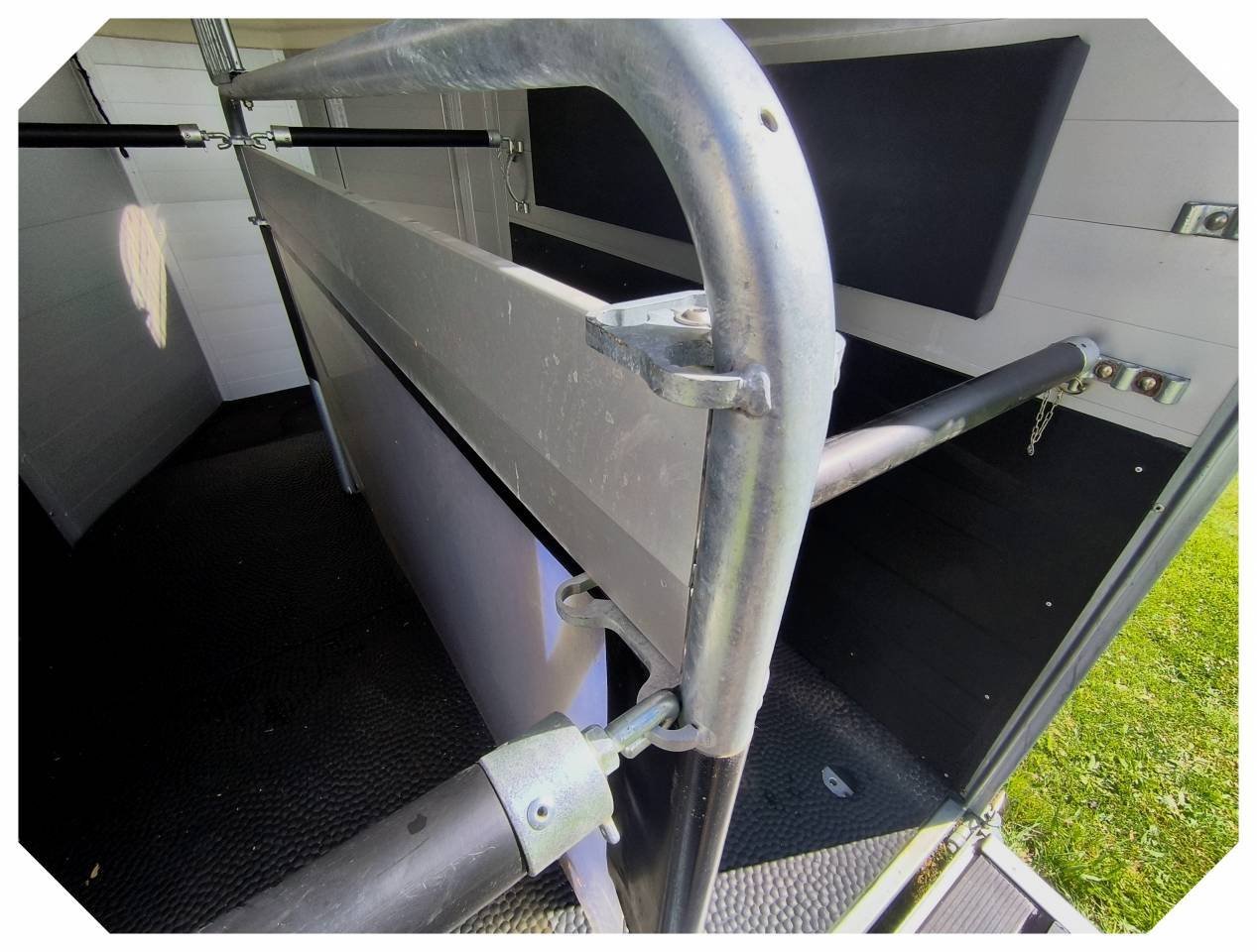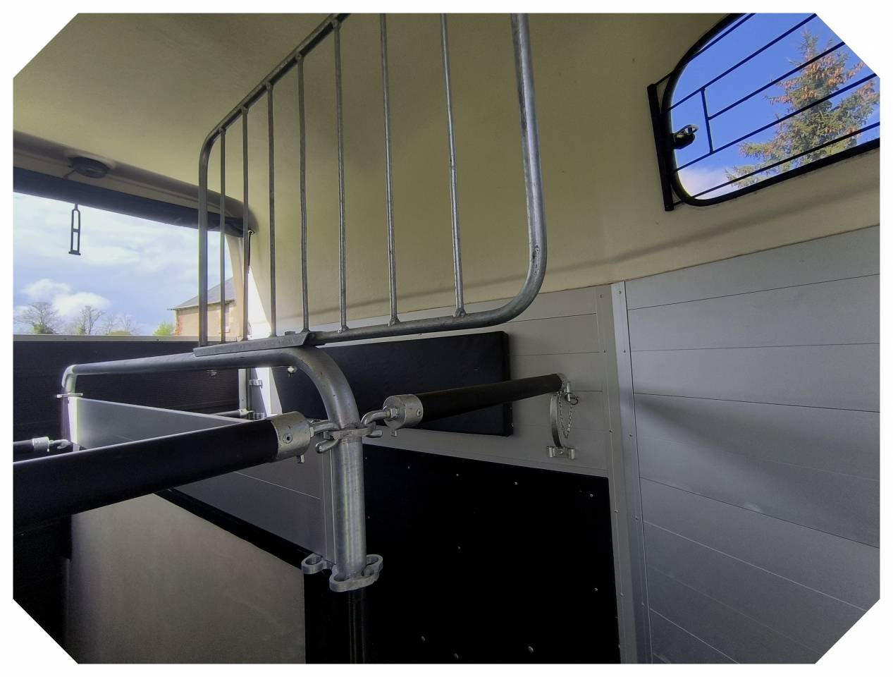 1 Roue jockey avec support – 1 Roue de secours avec support – 1 plateforme calèche – 1 séparation de tête grille métallique